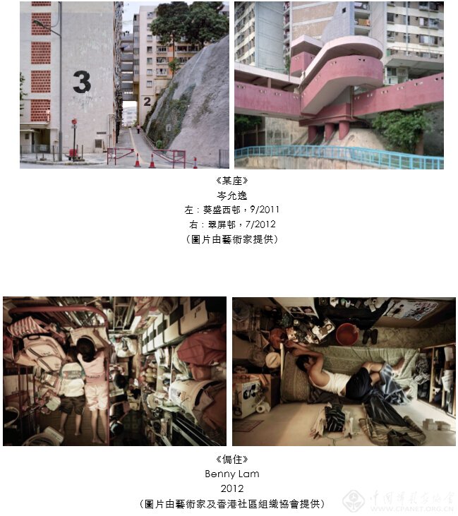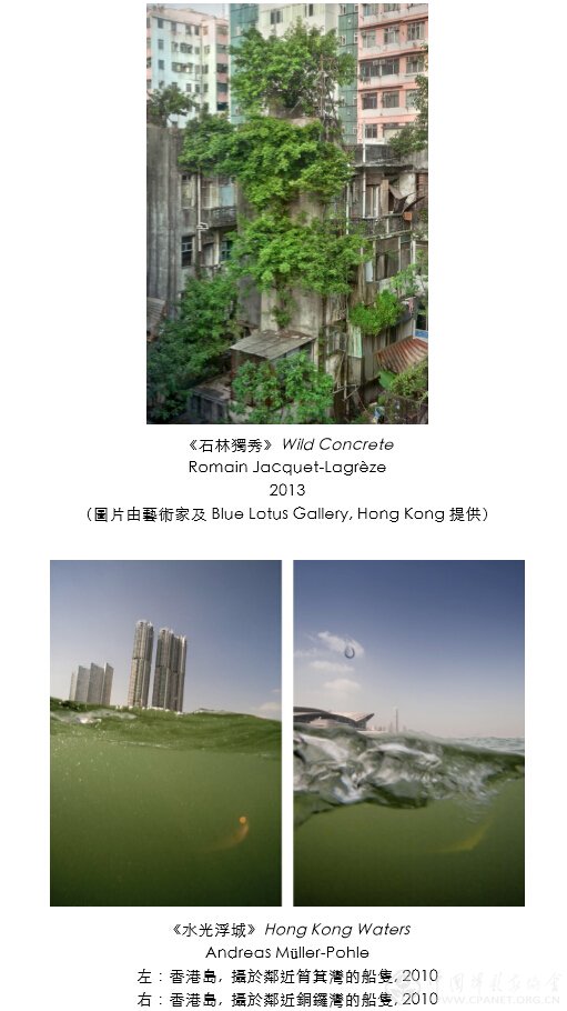 关于香港建筑以至生活面貌,美籍摄影艺术家Peter Steinhauer的《茧》透过建筑物的竹棚结构展现其对香港的迷思;岑允逸的《某座》呈现屋邨平庸、荒谬又超现实的一面;Benny Lam的《侷住》以鸟瞰式的角度捕捉劏房的生活面貌,展出的部份作品将以接近原貌比例呈现;新加坡籍摄影艺术家Wei Leng Tay透过其《香港生活》探索同一屋簷下种种角色及人际关系。至于自然与城市的关系,法籍摄影艺术家Romain Jacquet-Lagrèze记录生长在建筑物狭缝之间的树木;德籍摄影艺术家Andreas Müller-Pohle的《水光浮城》以半水面半水底的摄影手法呈现海洋与香港的关系;高志强则透过其一贯黑白摄影风格,探讨自然环境与城市发展的拉扯角力。