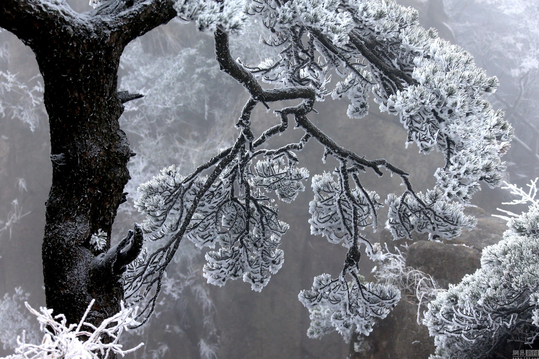 2016年11月23日,安徽省黄山市,黄山风景区玉树琼枝的雪景。受寒潮影响, 从11月22日晚开始,安徽黄山风景区迎来2016年入冬以来首场降雪。黄山风景区满山遍野,玉树琼枝,晶莹剔透,美不胜收。图:施广德/视觉中国